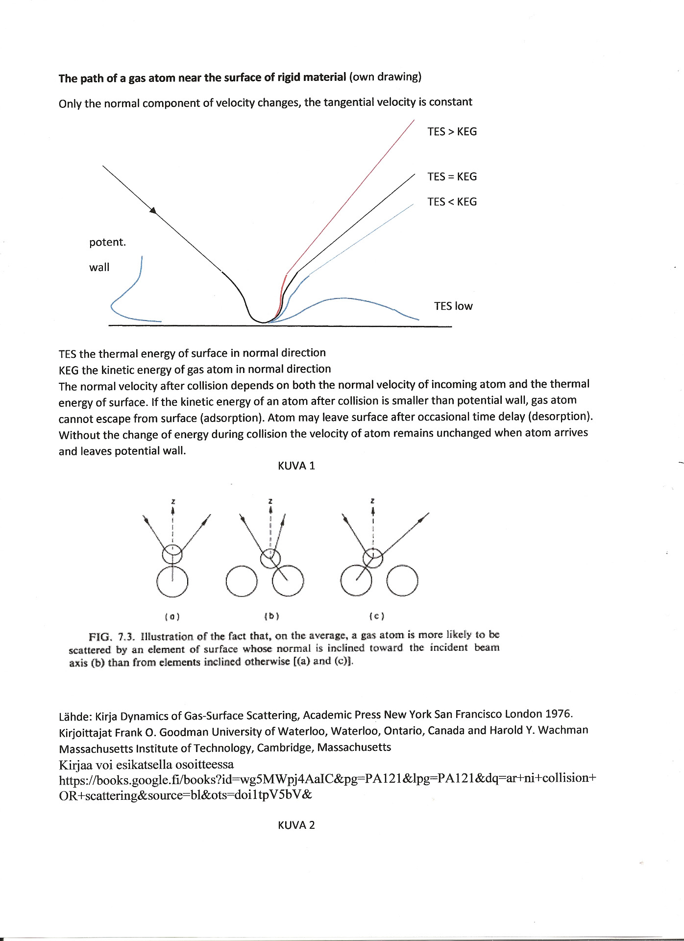 Alla olevissa kuvissa 1 ja 2 on esitetty kaasuatomin kulku kiinteän aineen pinnan kanssa tapahtuvan törmäyksen yhteydessä.