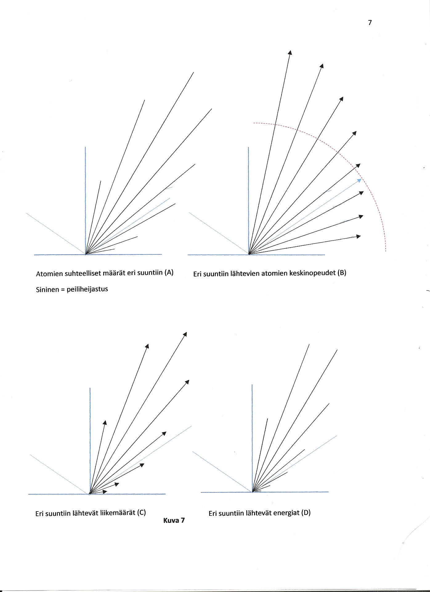 Kuvio 7B todistaa selvästi kuvissa 1 ja 2 esitetyt ilmiöt. Kuvioon on piirretty punaisella kaarella tulonopeuden itseisarvo ja sinisellä nuolella peiliheijastuneen, energiaa vaihtamattoman atomin nopeusvektori.