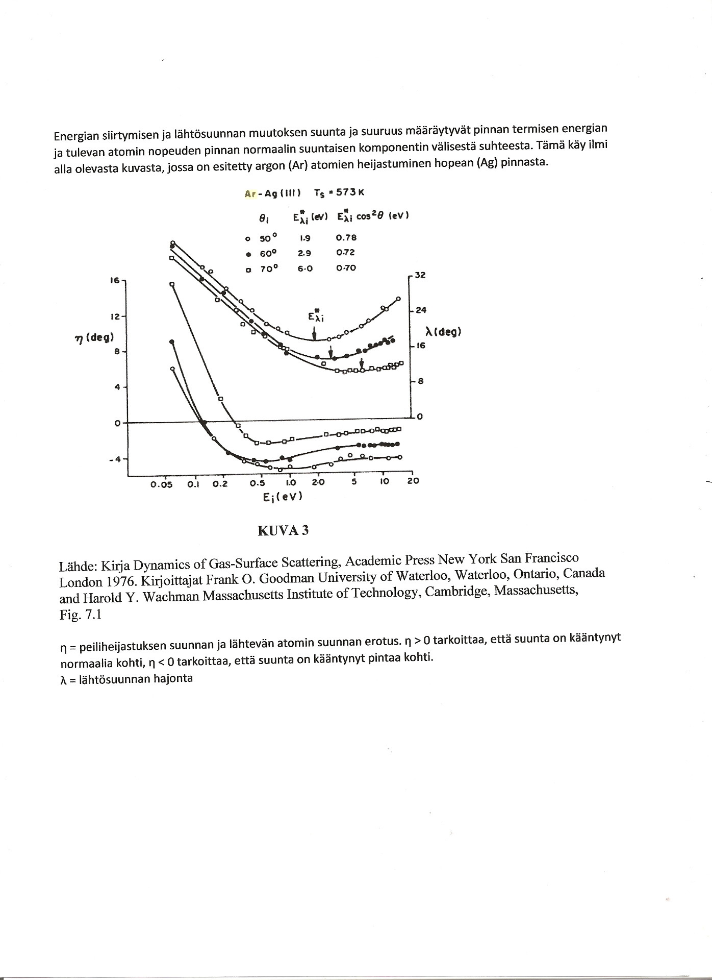 Kuvan 3 kuvaajista käy ilmi, että jos atomit tulevat kuumaan pintaan eri kulmassa, niin energian lisäys aiheuttaa loivemmin tulevalle atomille suuremman suunnan muutoksen kuin jyrkemmin tulevalle. Kuva. 3 osoittaa myös sen, että hitaamman tulonopeuden omaavat atomit saavat suuremman nopeuden lisäyksen kuin nopeammat atomit.